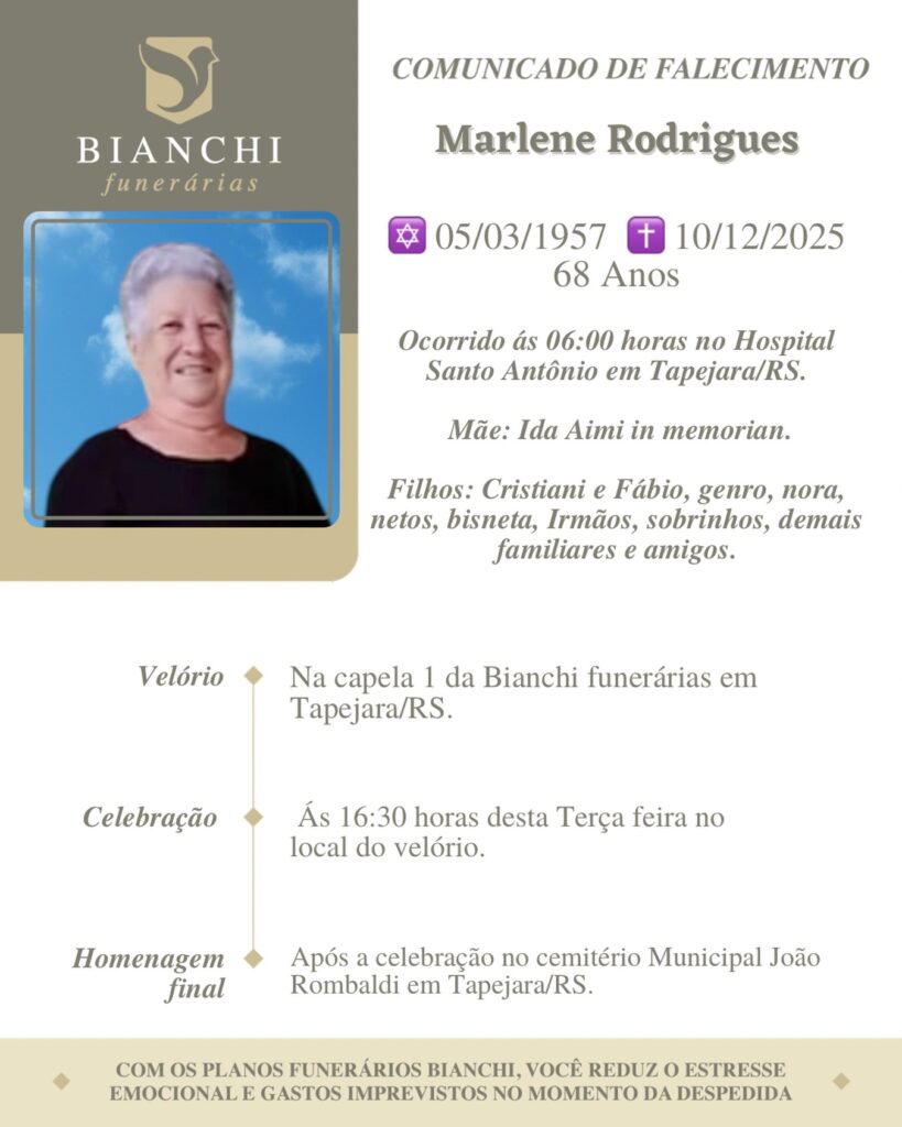 A Bianchi Funerárias, juntamente com a família Rodrigues, comunica com pesar, o falecimento de Marlene Rodrigues, ocorrido às 06 horas do dia 10/12/2025 no HSA de Tapejara com 68 anos de idade. Seu corpo está sendo velado na Capela 1 da Bianchi Funerárias. Celebração às 16h30 do dia 10/12/2025 e após seu sepultamento no Cemitério Municipal João Rombaldi.