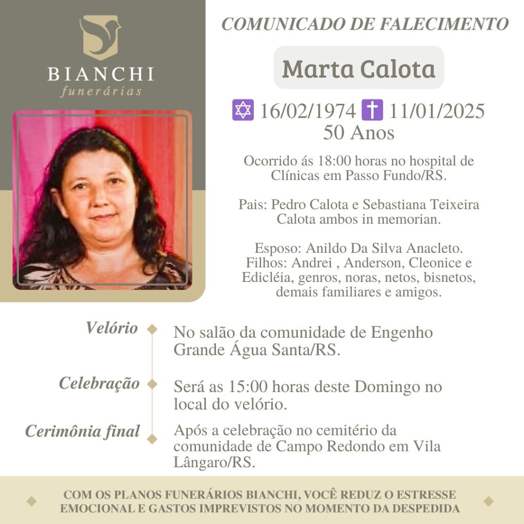A Bianchi Funerárias, juntamente com a família Calota, comunica com pesar, o falecimento de Marta Calota, ocorrido às 18 horas do dia 11/01/2025 no Hospital de Clínicas de Passo Fundo com 50 anos de idade. Seu corpo está sendo velado no Salão da Comunidade de Engenho Grande – Água Santa. Celebração às 15 horas do dia 12/01/2025 e após seu sepultamento no Cemitério da Comunidade de Campo Redondo – Vila Lângaro.