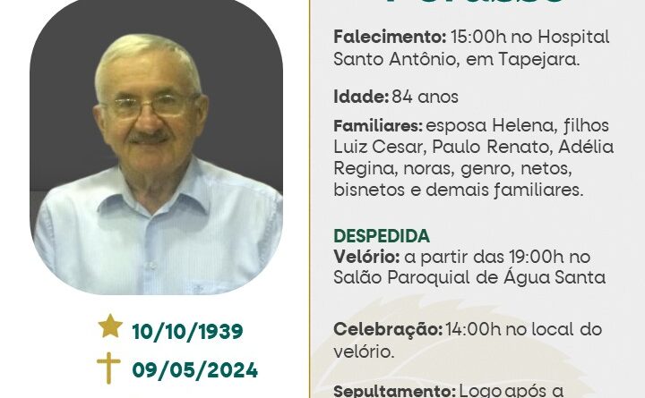 A Funerária São Cristóvão, juntamente com a família Peruzzo, comunica com pesar, o falecimento de Martim Peruzzo, ocorrido às 15 horas do dia 09/05/2024 no HSA de Tapejara com 84 anos de idade. Seu corpo está sendo velado no Salão Paroquial de Água Santa. Celebração às 14 horas do dia 10/05/2024 no local do velório e após seu sepultamento no Cemitério Municipal de Água Santa.