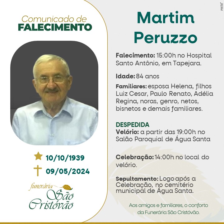 A Funerária São Cristóvão, juntamente com a família Peruzzo, comunica com pesar, o falecimento de Martim Peruzzo, ocorrido às 15 horas do dia 09/05/2024 no HSA de Tapejara com 84 anos de idade. Seu corpo está sendo velado no Salão Paroquial de Água Santa. Celebração às 14 horas do dia 10/05/2024 no local do velório e após seu sepultamento no Cemitério Municipal de Água Santa.