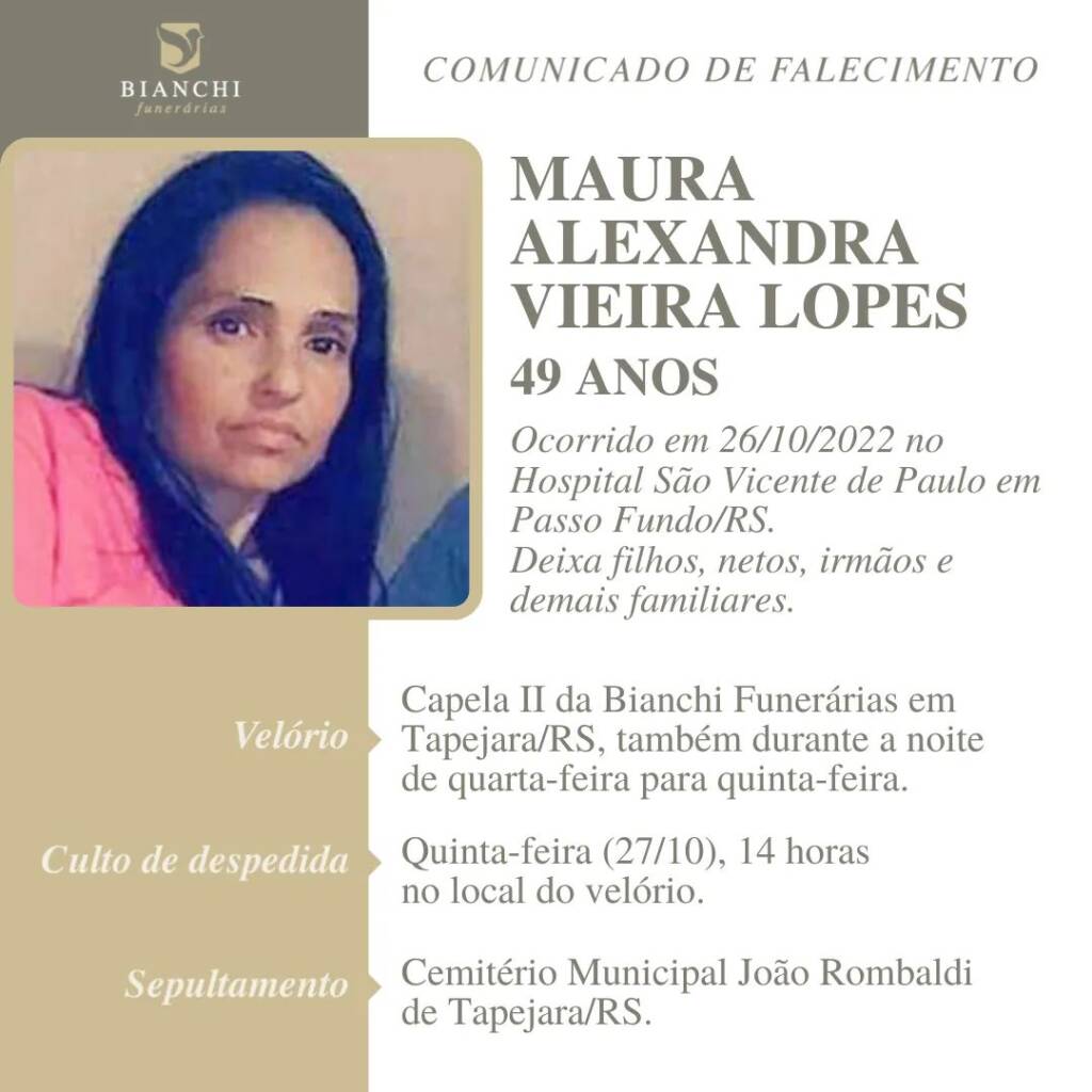 A BianchiFunerárias, juntamente com a família Vieira Lopes, comunica com pesar, o falecimento de Maura Alexandra Vieira Lopes, ocorrido às 14:00 horas do dia 26/10 no Hospital São Vicente de Paulo de Passo Fundo com 49 anos de idade. Seu corpo está sendo velado na Capela I da Bianchi Funerárias. Culto de despedita às 14:00 horas do dia 27/10 e após seu sepultamento no Cemitério Municipal João Rombaldi.