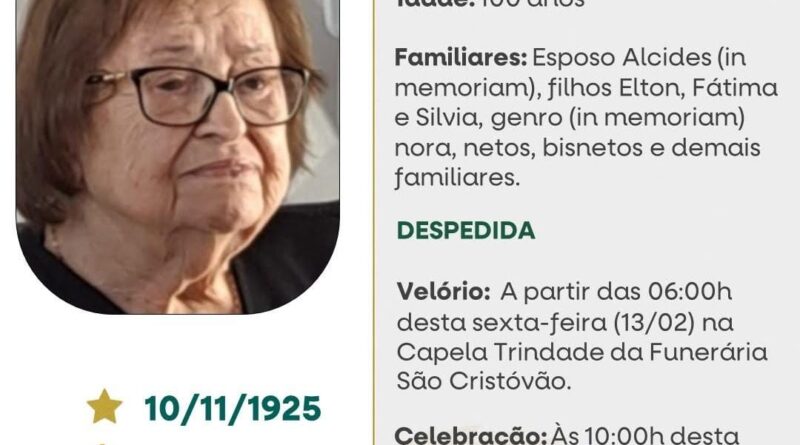 A Funerária São Cristóvão, juntamente coma família Zanini e Sbalchiero, comunica com pesar, o falecimento de Mercedes Zanini Sbalchiero, ocorrido às 11h30 do dia 12/02/2026 na Policlínica de Pato Branco, com 100 anos de idade. Seu corpo estará sendo velado na Capela Trindade da Funerária São Cristóvão. Celebração às 10 horas do dia 13/02/2026 e após, seu sepultamento no Cemitério Municipal João Rombaldi.