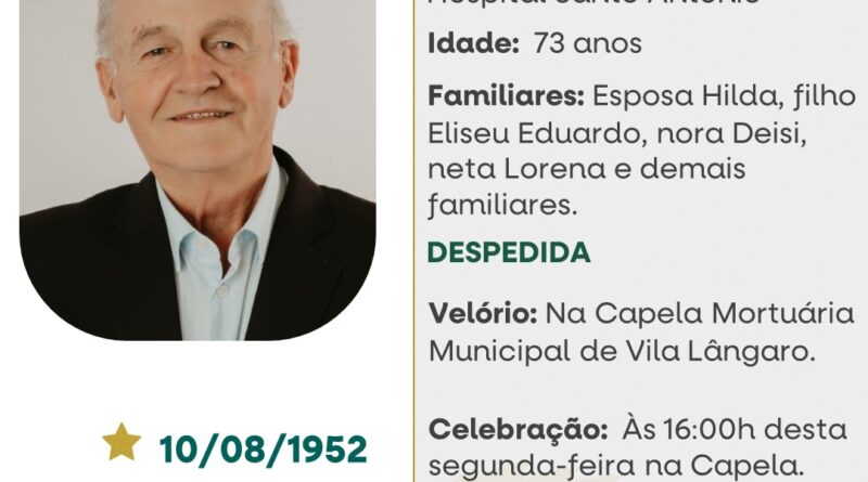 A Funerária São Cristóvão, juntamente com a família Arcari, comunica com pesar, o falecimento de Moacir, ocorrido à 19h30 do dia 22/03/2026 no HSA de Tapejara com 73 anos de idade. Seu corpo está sendo velado na Capela Mortuária Municipal de Vila Lângaro. Celebração às 16 horas do dia 23/03/2026 e após seu sepultamento no Cemitério Municipal de Vila Lângaro.