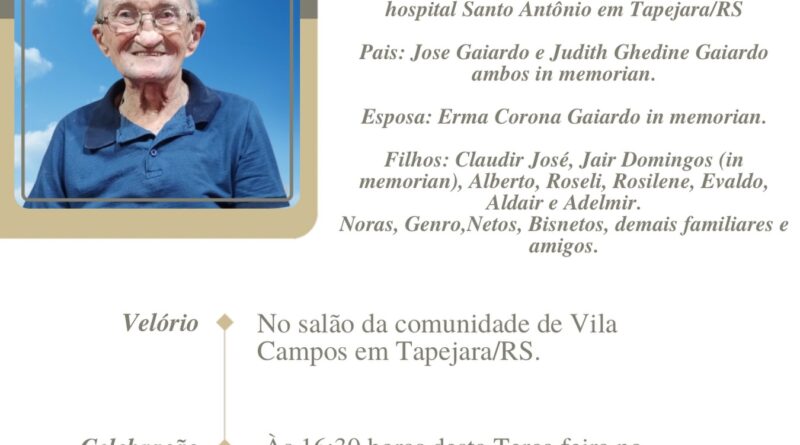 A Bianchi Funerárias juntamente com a família Gaiardo, comunica com pesar, o falecimento de Moacir Remigio Gaiardo, ocorrido às 02 horas do dia 28/04/2026 no HSA de Tapejara com 88 anos de idade. Seu corpo está sendo velado no Salão da Comunidade de Vila Campos. Celebração às 16h30 do dia 28/04/2026 e após seu sepultamento no Cemitério da mesma Comunidade.