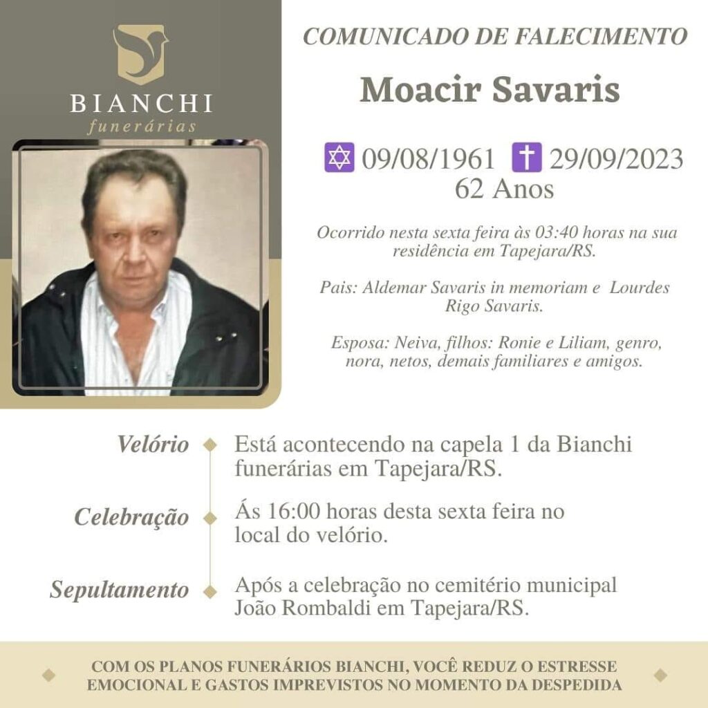A Bianchi Funerárias, juntamente com a família Savaris, comunica com pesar, o falecimento de Moacir Savaris, ocorrido às 03h 40 em sua residência em Tapejara, dia 29/09/2023 com 62 anos de idade. Seu corpo está sendo velado na Capela 1 da Bianchi Funerárias. Celebração às 16 horas de hoje e após seu sepultamento no Cemitério Municipal João Rombaldi.