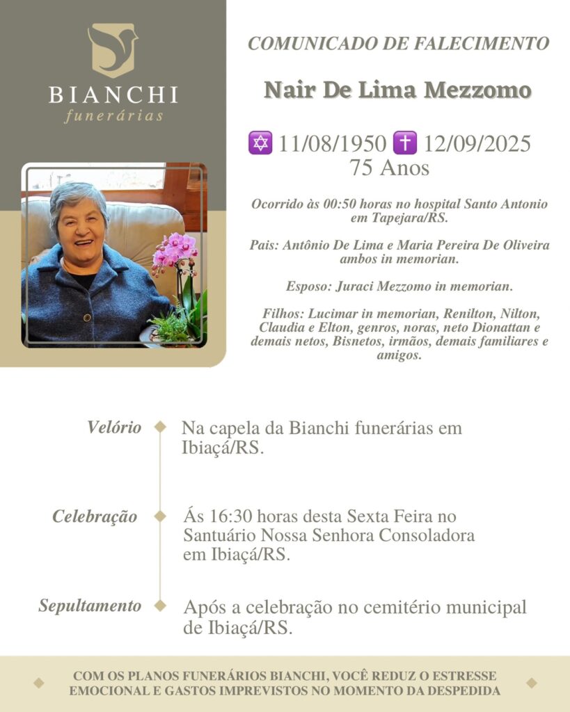 A Bianchi Funerárias, juntamente com a família de Mezzomo, comunica com pesar, o falecimento de Nair de Lima Mezzomo, ocorrido à 00h50 do dia 12/09/2025 no HSA de Tapejara com 75 anos de idade. Seu corpo está sendo velado na Capela da Bianchi Funerárias de Ibiaçá. Celebração às 16h30 do dia 12/09/2025 no Santuário Nossa Senhora Consoladora e após seu sepultamento no Cemitério Municipal João Rombaldi.