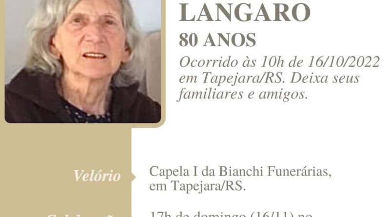 A Bianchi Funerárias, juntamente com a família Lângaro, comunica com pesar, o falecimento da senhora Nair Lângaro, ocorrido às 10:00 horas do dia 16/10 em Tapejara com 80 anos de idade. Seu corpo está sendo velado na Capela I da Bianchi Funerárias. Celebração às 17:00 horas e após seu sepultamento no Cemitério Municipal João Rombaldi.