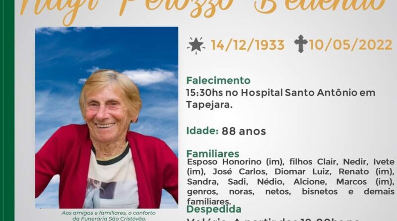 A Funerária são Cristóvão, juntamente com a família Bedendo, comunica com pesar, o falecimento da senhora Nair Perozzo Bedendo, ocorrido às 15:30 horas de terça-feira (10/05) no HSA com 88 anos de idade. Seu corpo será velado a partir das 19:00 horas na Capela Municipal de Vila Lângaro. Celebração às 10:00 horas de quarta- feira (11/05) na Capela e após seu sepultamento no Cemitério Municipal de Vila Lângaro.