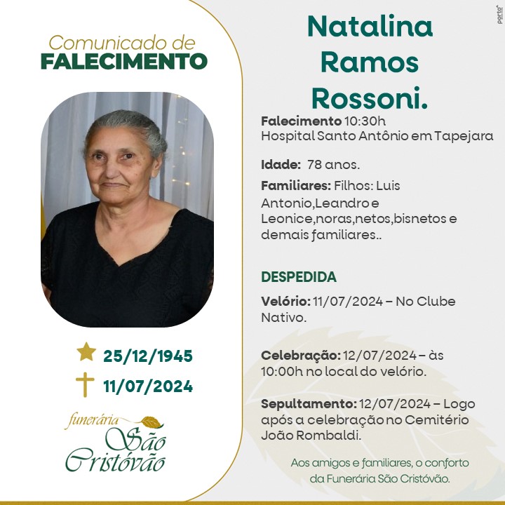 A Funerária São Cristóvão, juntamente com a família Rossoni, comunica com pesar, o falecimento de Natália Ramos Rossoni, ocorrido às 10h30 do dia 11/07/2024 no HSA de Tapejara com 78 anos de idade. Seu corpo está sendo velado no Clube Nativo de Tapejara. Celebração às 10 horas do dia 12/07/2024 e após seu sepultamento no Cemitério Municipal João Rombaldi.