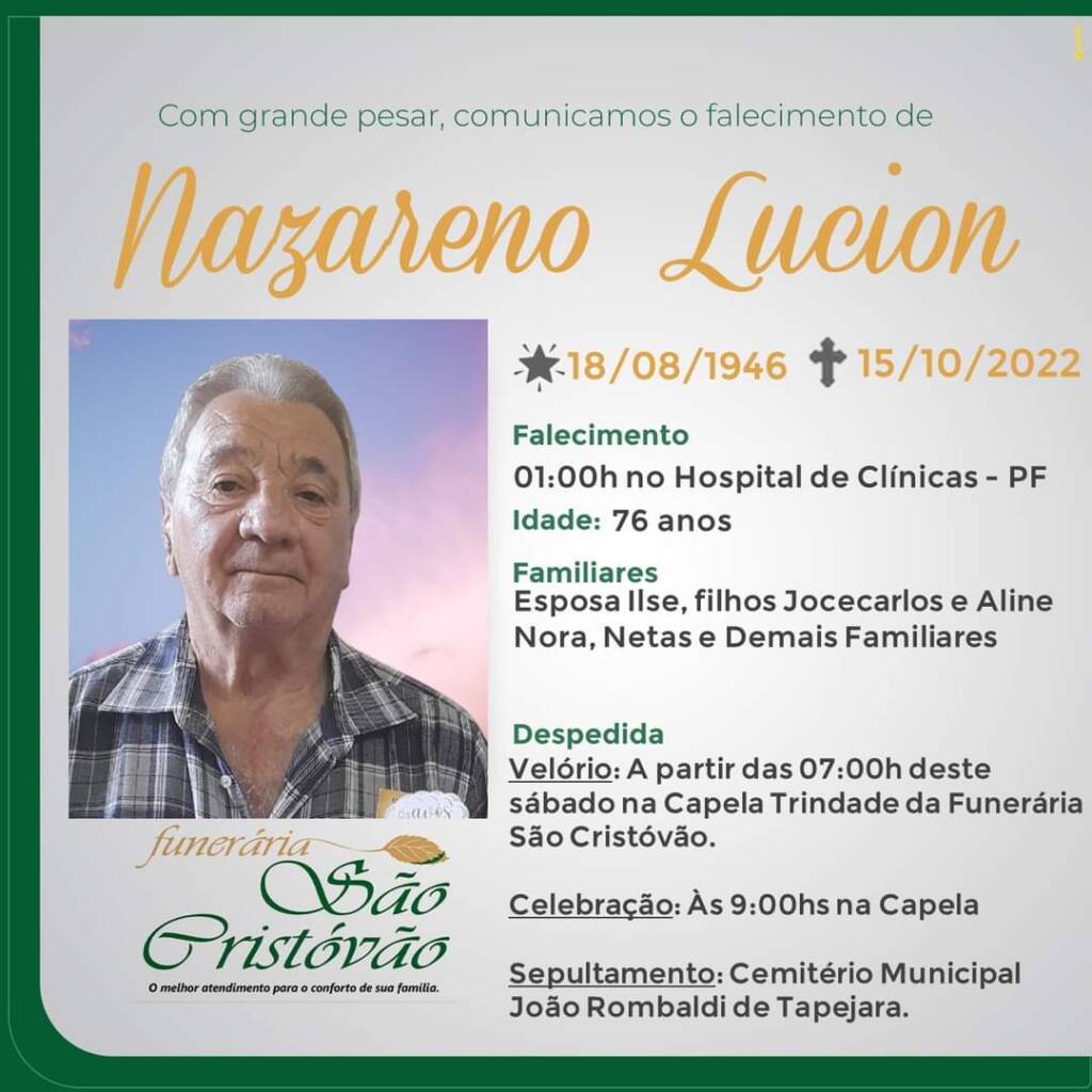 A Funerária São Cristóvão, juntamente com a família Lucion, comunica com pesar, o falecimento do senhor Nazareno Lucion, ocorrido à 01:00 horas do dia 15/10 no Hospital de Clínicas de PF com 76 anos de idade. Seu corpo será velado, a partir das 07:00 horas na Capela Trindade da Funerária São Cristóvão. Celebração às 09:00 horas e após seu sepultamento no Cemitério Municipal João Rombaldi.