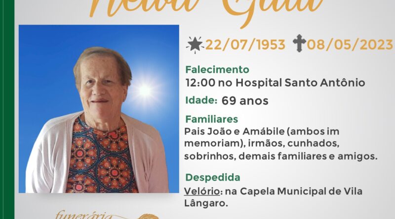 A Funerária São Cristóvão, juntamente com a família Gatti, comunica com pesar, o falecimento de Neiva Gatti, ocorrido às 12 horas do dia 08/05/2023 no HSA com 69 anos de idade. Seu corpo está sendo velado na Capela Municipal de Vila Lângaro. Celebração às 09 horas do dia 09/05/2023 no local do velório e após seu sepultamento no Cemitério de Arroio de Fátima – Coxilha.