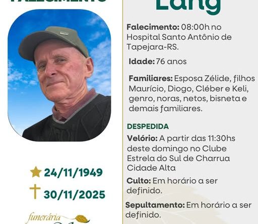 A Funerária São Cristóvão, juntamente com a família Lang, comunica com pesar, o falecimento de Nelson Lang, ocorrido às 08 horas do dia 30/11/2025 no HSA de Tapejara com 76 anos de idade. Seu corpo será velado a partir das 11h30 no Clube Estrela do Sul em Charrua Cidade Alta. Culto e sepultamento com horário a serem definidos. Sepultamento será no Cemitério de Charrua Cidade Alta.