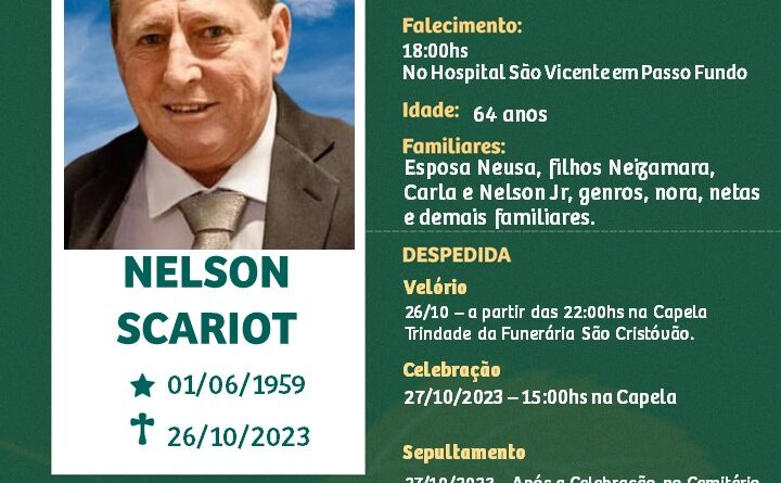 A Funerária São Cristóvão, juntamente com a família Scariot, comunica com pesar, o falecimento de Nelson Scariot, ocorrido às 18 horas do dia 26/10/2023 no Hospital São Vicente de Paulo de Passo fundo. Seu corpo está sendo velado na Capela Trindade da Funerária São Cristóvão. Celebração às 15 horas do dia 27/10/2023 e após seu sepultamento no Cemitério Municipal João Rombaldi.