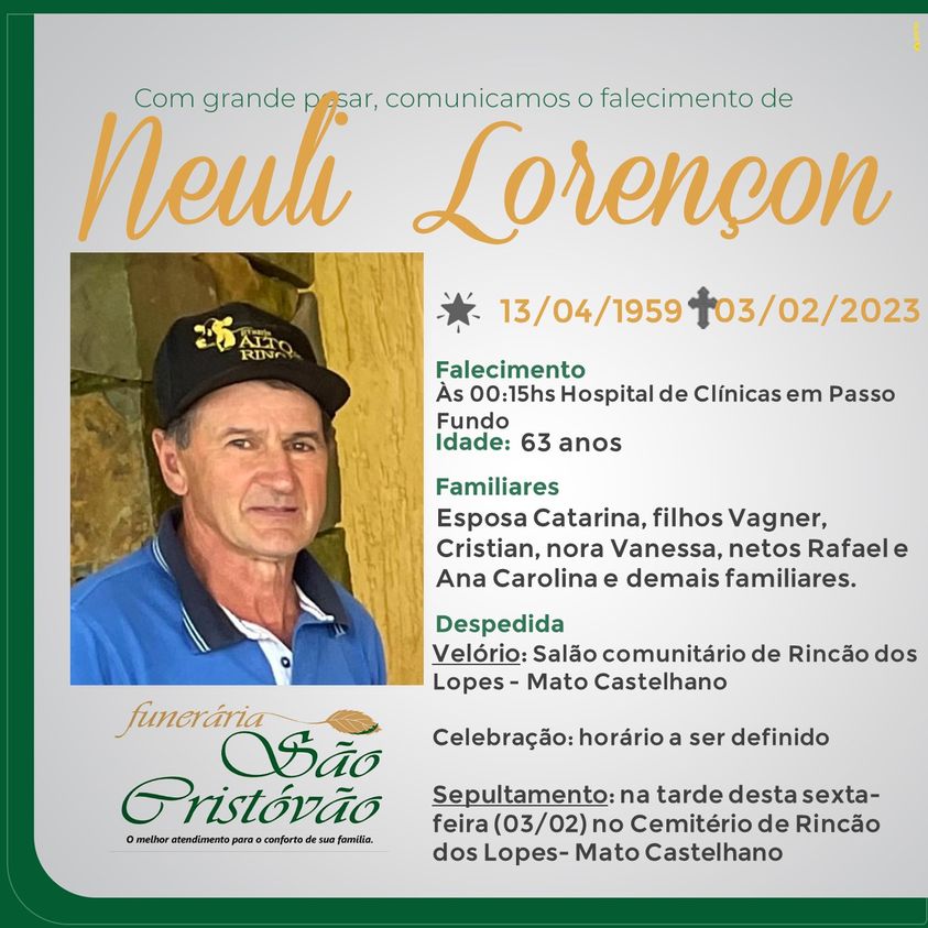 A Funerária São Cristóvão, juntamente com a família Lorençon, comunica com pesar, o falecimento de Neuli Lorençon, ocorrido às 00:15 horas do dia 03/02/2023 no Hospital de Clínicas em Passo Fundo com 63 anos de idade. Seu corpo está sendo velado no Salão Comunitário de Rincão dos Lopes – Mato Castelhano. Celebração com horário a ser definido e sepultamento na tarde desta sexta-feira, 03/02/2023 no Cemitério da mesma comunidade.
