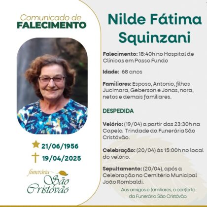 A Funerária São Cristóvão, juntamente com a família Squinzani, comunica com pesar, o falecimento de Nilde Fátima Squinzani, ocorrido às 18h40 do dia 19/04/2025 no Hospital de Clínicas de Passo Fundo com 68 anos de idade. Seu corpo está sendo velado na Capela Trindade da Funerária São Cristóvão. Celebração às 15 horas do dia 20/04/2025 e após seu sepultamento no Cemitério Municipal João Rombaldi.