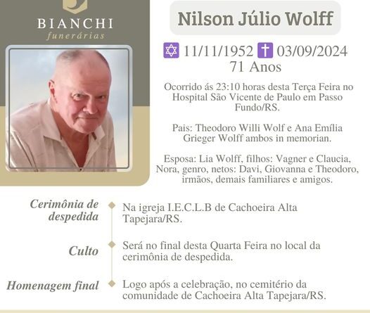 A Bianchi Funerárias, juntamente com a família Wolff, comunica com pesar, o falecimento de Nilson Julio Wolff, ocorrido às 23h10 do dia 03/09/2024 no Hospital São Vicente de Paulo de Passo Fundo com 71 anos de idade. Seu corpo está sendo velado na Igreja I.C.L.B de Cachoeira Alta – Tapejara. Celebração no final da tarde do dia 04/09/2024 e após seu sepultamento no Cemitério da mesma localidade.