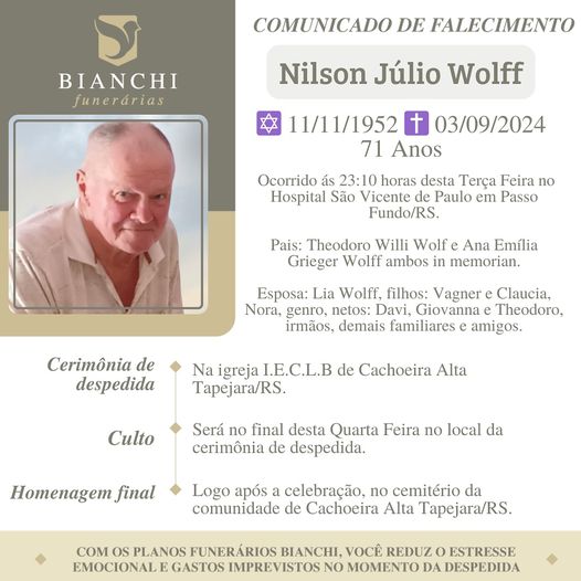 A Bianchi Funerárias, juntamente com a família Wolff, comunica com pesar, o falecimento de Nilson Julio Wolff, ocorrido às 23h10 do dia 03/09/2024 no Hospital São Vicente de Paulo de Passo Fundo com 71 anos de idade. Seu corpo está sendo velado na Igreja I.C.L.B de Cachoeira Alta – Tapejara. Celebração no final da tarde do dia 04/09/2024 e após seu sepultamento no Cemitério da mesma localidade.