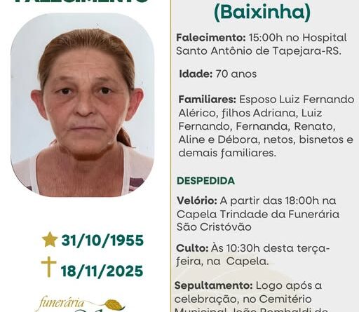 A   Funerária São Cristóvão, juntamente com a família Ferrasso, comunica com pesar, o falecimento de Nilva Ferrasso – “Baixinha”, ocorrido às 15 horas do dia 18/11/2025 no HSA em Tapejara com 70 anos de idade. Seu corpo está sendo guardado na Capela Trindade da Funerária São Cristóvão. Culto às 10h30 do dia 19/11/2025 e após seu sepultamento no Cemitério Municipal João Rombaldi de Tapejara.