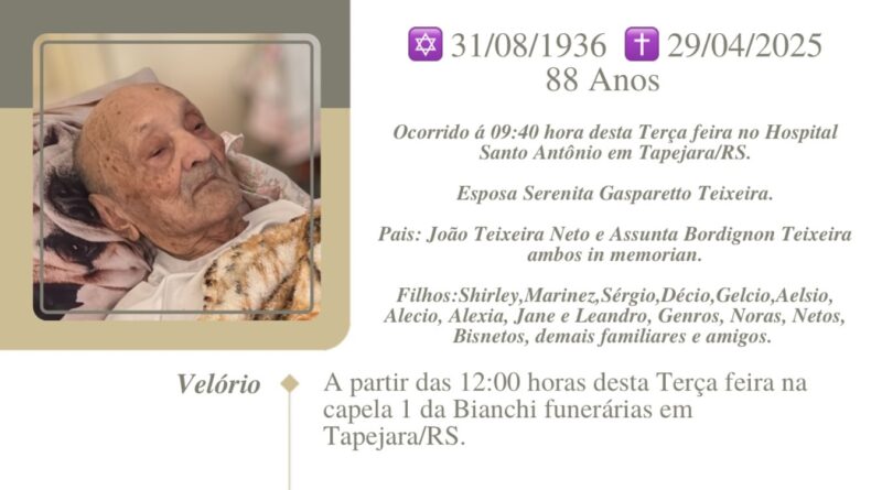 A Bianchi Funerárias, juntamente com a família Teixeira, comunica com pesar, o falecimento de Odi Bordignon Teixeira, ocorrido às 09h40 do dia 29/04/2025 no HSA de Tapejara com 88 anos de idade. Seu corpo está sendo velado na Capela 1 da Funerárias Bianchi em Tapejara. Celebração às 16h30 do dia 29/04/2025 e após seu sepultamento no Cemitério Municipal João Rombaldi.