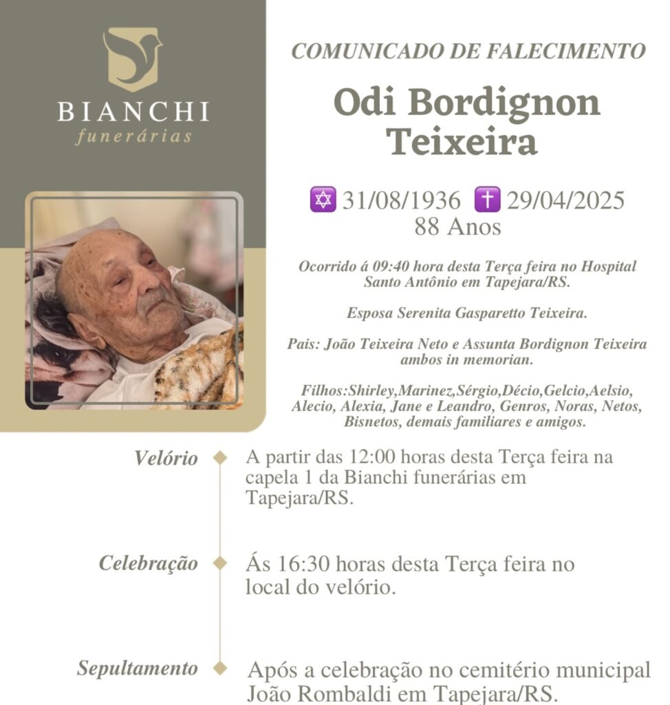 A Bianchi Funerárias, juntamente com a família Teixeira, comunica com pesar, o falecimento de Odi Bordignon Teixeira, ocorrido às 09h40 do dia 29/04/2025 no HSA de Tapejara com 88 anos de idade. Seu corpo está sendo velado na Capela 1 da Funerárias Bianchi em Tapejara. Celebração às 16h30 do dia 29/04/2025 e após seu sepultamento no Cemitério Municipal João Rombaldi.