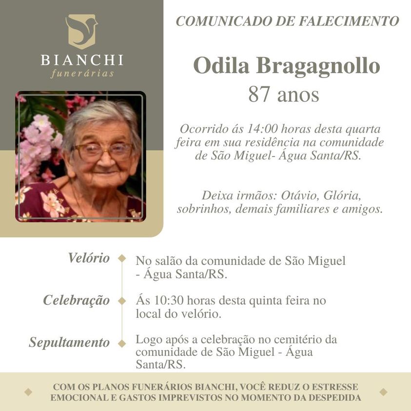 A Bianchi Funerárias, juntamente com a família Bragagnollo, comunica com pesar, o falecimento de Odila Bragagnollo, ocorrido às 14:00 horas do dia 25/01/2023 em sua residência na Comunidade de São Miguel – Água Santa com 87 anos de idade. Seu corpo está sendo velado na Comunidade de São Miguel Água Santa. Celebração às 10:30 horas do dia 26/01/2023 no Salão e após seu sepultamento no Cemitério da mesma Comunidade.