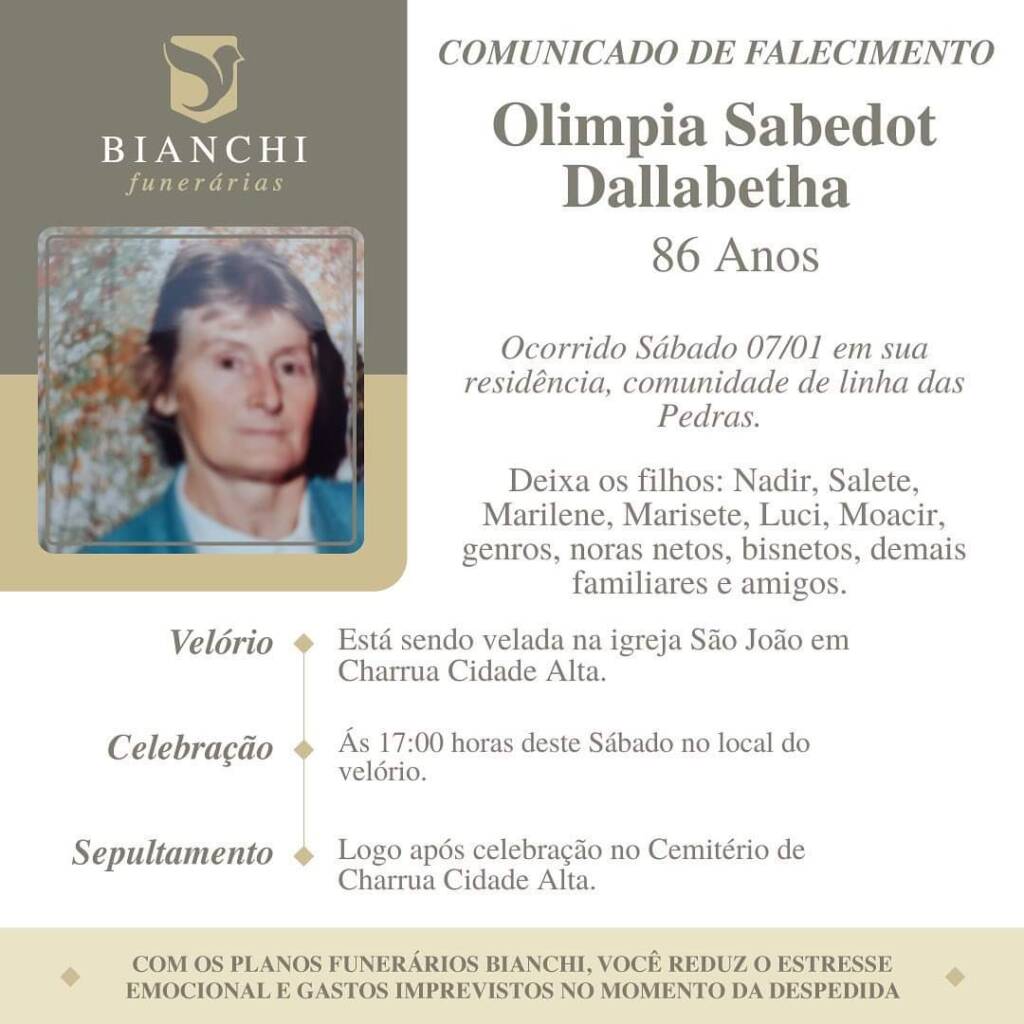 A Bianchi Funerárias, juntamente com a família Dallabetha, comunica com pesar, o falecimento de OlimpiaSabetoo Dallabetha, ocorrido dia 07/01/2023 em sua residencia em Linha das Pedras – Charrua com 86 anos de idade. Seu corpo está sendo velado na Igreja São João de Charrua Cidade Alta. Celebração às 17:00 horas deste sábado e após seu sepultamento no Cemitério de Charrua Cidade Alta.