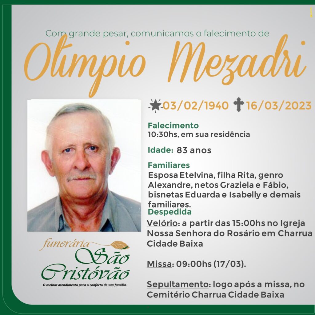 A Funerária São Cristóvão, juntamente com a família Mezadri, comunica com pesar, o falecimento de Olímpio Mezadri , ocorrido as 10:30 horas do dia 16/03/2023 em sua residência, com 83 anos de idade. Seu corpo está sendo velado na Igreja Nossa Senhora do Rosário em Charrua – Cidade Baixa. Missa de corpo presente as 10:30 horas do dia 17/03/2023 e logo após seu sepultamento no Cemitério de Charrua Cidade Baixa.