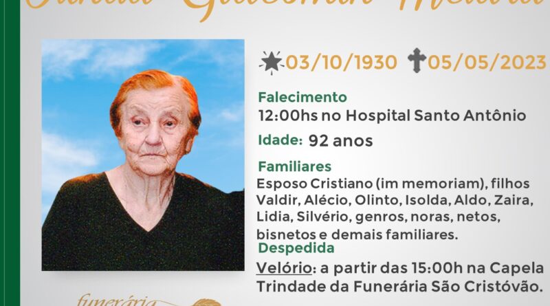 A Funerária São Cristóvão, juntamente com a família Melara, comunica com pesar, o falecimento de Olinda Giacomin Melara, ocorrido às 12 horas do dia 05/05/2023 no HSA com 92 anos de idade. Velório a partir das 15 horas na Capela Trindade da Funerária São Cristóvão. Celebração às 09 horas do dia 06/05/2023 na Capela e após seu sepultamento no Cemitério Municipal João Rombaldi.