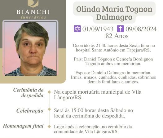 A Bianchi Funerárias, juntamente com a família Dalmagro, comunica com pesar, o falecimento de Olinda Maria Tognon Dalmagro, ocorrido às 21h40 do dia 09/08/2024 no HSA de Tapejara com 82 anos de idade. Seu corpo está sendo velado na Capela Mortuária de Vila Lângaro. Celebração às 15 horas do dia 05/08/2024 e após eu sepultamento no Cemitério da Comunidade de Campo Redondo – Vila Lângaro.