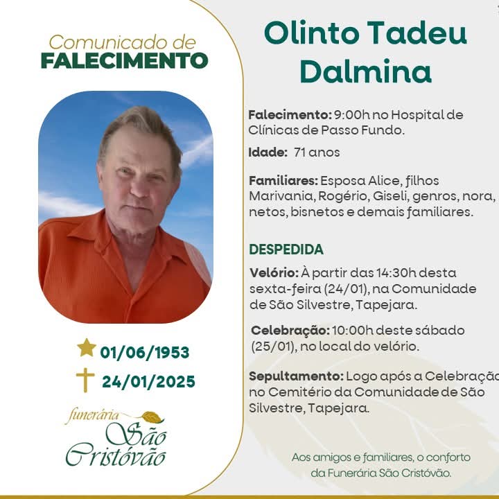 A Funerária São Cristóvao, juntamente com a familia Dalmina,comunica com pesar, o falecimento de Olinto Tadeu Dalmina, ocorrido às 14h30 do dia 24/01/2025 na Comunidade de São Silvestre Tapejara com 71 anos de idade. Seu corpo está sendo velado no Salão da Comunidade de São Silvestre. Sepultamento às 10 horas do dia 25/01/2025 e após seu sepultamento no Cemitério da mesma comunidade.