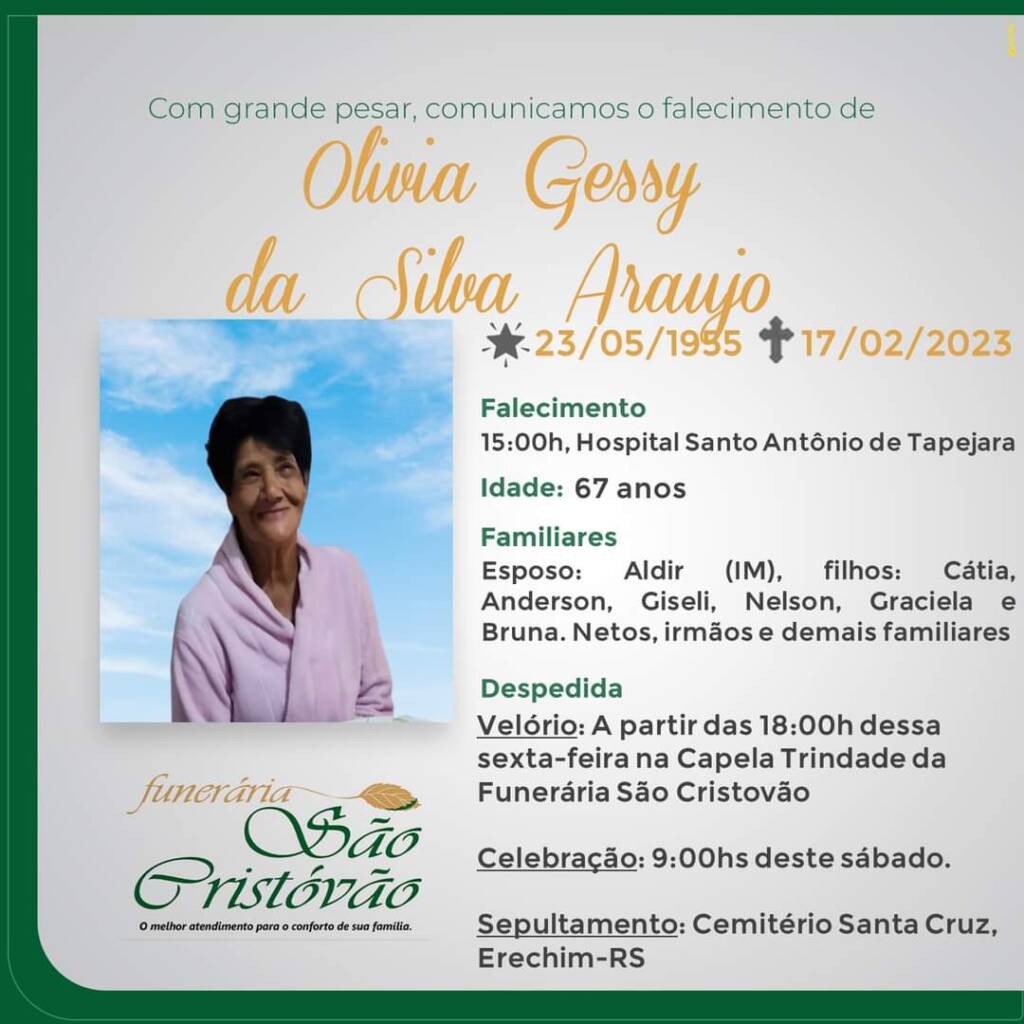 A Funerária São Cristóvão, juntamente com a família Araujo, comunica com pesar, o falecimento de Olívia Gessy da Silva Araujo, ocorrido às 15:00 horas do dia 17/02/2023 no HSA com 67 anos de idade. Seu corpo está sendo velado na Capela Trindade da Funerária São Cristóvão. Celebração às 09:00 horas do dia 18/02/203 e após seu sepultamento no Cemitério Santa Cruz de Erechim.