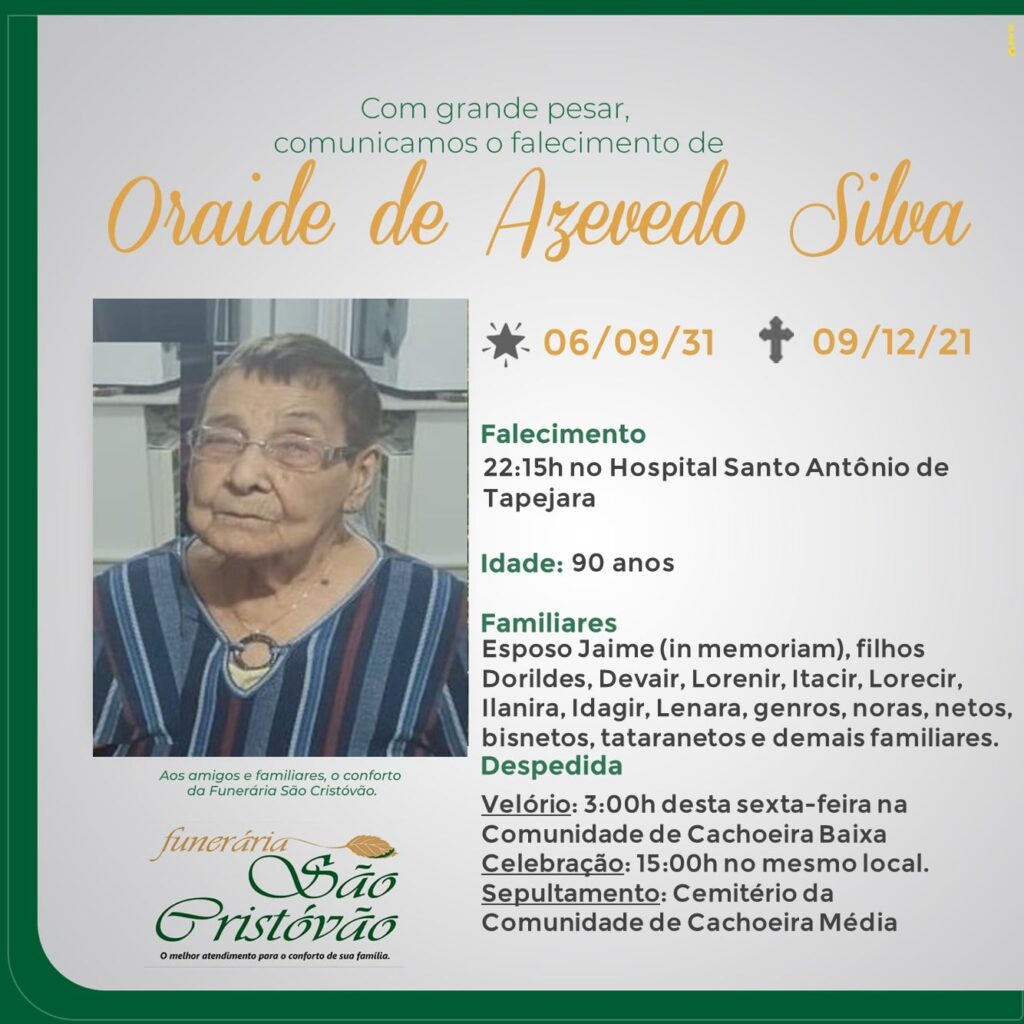 A Funerária São Cristóvão, juntamente com a família Azevedo Silva, comunica com pesar, o falecimento da senhora Oraide Azevedo Silva, com 90 anos de idade, ocorrido na noite de quinta-feira (09/12) no Hospital Santo Antônio de Tapejara. O velório acontece na Comunidade de Cachoeira Baixa. Celebração às 15:00 horas no local e após seu sepultamento no Cemitério da Comunidade de Cachoeira Média.
