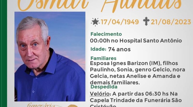 A Funerária São Cristóvão, juntamente com a família Althaus, comunica com pesar, o falecimento de Osmar Althaus, ocorrido à 00 hora do dia 21/08/2023 no HSA com 74 anos de idade. Seu corpo está sendo velado na Capela da Funerária São Cristóvão. Celebração com horário a ser definido. Sepultamento às 17 no Cemitério Municipal João Rombaldi.