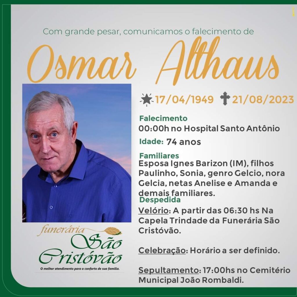 A Funerária São Cristóvão, juntamente com a família Althaus, comunica com pesar, o falecimento de Osmar Althaus, ocorrido à 00 hora do dia 21/08/2023 no HSA com 74 anos de idade. Seu corpo está sendo velado na Capela da Funerária São Cristóvão. Celebração com horário a ser definido. Sepultamento às 17 no Cemitério Municipal João Rombaldi.