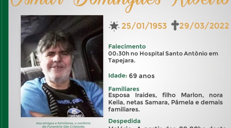 A Funerária São Cristóvão, juntamente com a família Domingues Ribeiro, comunica com pesar, o falecimento do senhor Osmar Domingues Ribeiro, ocorrido às 00:30 horas desta terça-feira (29/03,) no HSA de Tapejara, com 69 anos de idade. Seu corpo será velado a partir das 08:00 horas, na Capela da Funerária São Cristóvão. Culto às 15:00 horas e após seu sepultamento no Cemitério Municipal João Rombaldi.