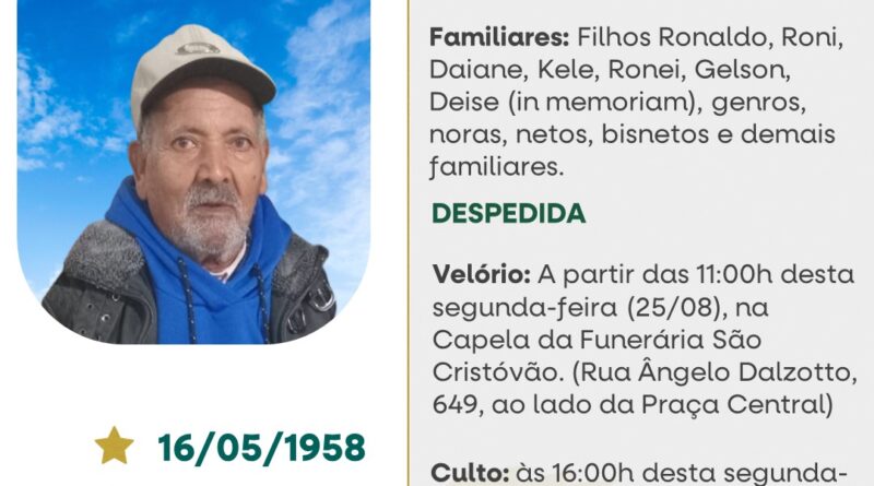 A Funerária São Cristóvão juntamente com a família Camargo, comunica com pesar, o falecimento de Osmarino dos Santos Camargo, ocorrido às 04 horas do dia 25/08/2025 no Hospital São Vicente de Paulo de Passo Fundo com 72 anos de idade. Seu corpo será guardado a partir das 11 horas na Capela da Funerária São Cristóvão. Culto às 16 horas do dia 25/08/2025 e após seu sepultamento no Cemitério Municipal João Romaldi.