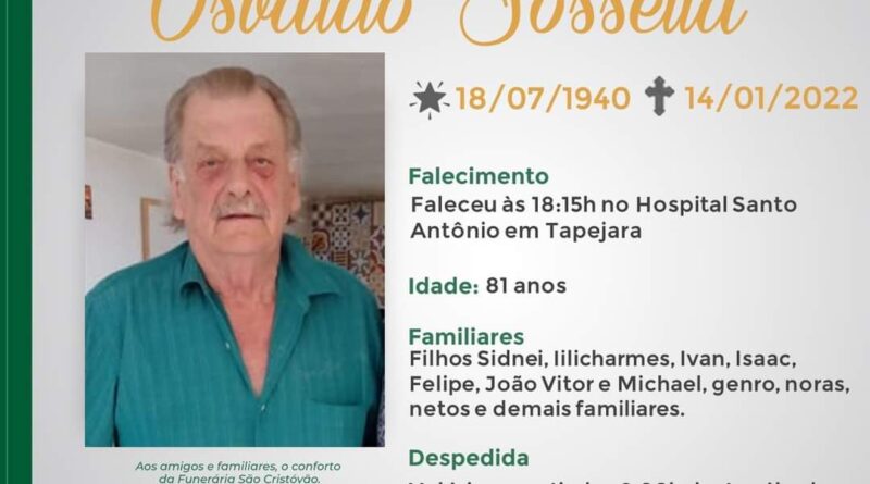 A Funerária São Crisóvão, juntamente com a família Sossella, comunica com pesar, o falecimento do senhor Osvaldo Sossella com 81 anos de idade, ocorrido às 18:15 horas desta sexta-feira (14/01), no Hospital Santo Antônio de Tapejara. Seu corpo será velado a partir das 06:00 horas de sábado na capela Trindade da Funerária São Cristóvão. Às 10:30 horas haverá celebração no local do velório e logo após seu sepultamento no Cemitério Municipal João Rombaldi.