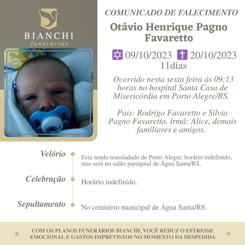 A Bianchi Funerárias, juntamente com a família Favaretto, comunica com pesar, o falecimento de Otávio Henrique Pagno Favaretto, ocorrido às 09h13 do dia 20/10/2023 na Santa Casa de Misericórdia de Porto Alegre com 11 dias de idade. Seu corpo está sendo transladado para Água Santa. Atos de encomendação e sepultamento com horário a definir.