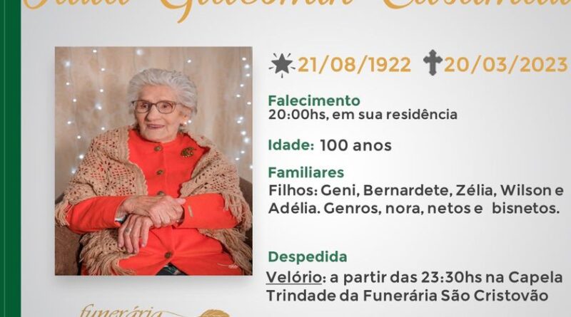 A Funerária São Cristóvão, juntamente com a família Casamali, comunica com pesar, o falecimento de Otília Giacomin Casamali, ocorrido às 20 horas do dia 20/03/2023 em sua residência com 100 anos de idade. Seu corpo está sendo velado na Capela Trindade da Funerária São Cristóvão. Celebração às 14 horas do dia 21/03/2023 e após seu sepultamento no Cemitério Municipal João Rombali.