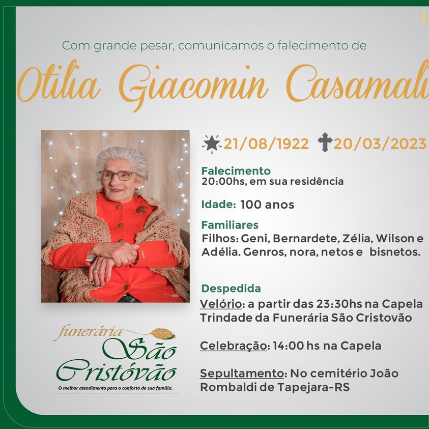 A Funerária São Cristóvão, juntamente com a família Casamali, comunica com pesar, o falecimento de Otília Giacomin Casamali, ocorrido às 20 horas do dia 20/03/2023 em sua residência com 100 anos de idade. Seu corpo está sendo velado na Capela Trindade da Funerária São Cristóvão. Celebração às 14 horas do dia 21/03/2023 e após seu sepultamento no Cemitério Municipal João Rombali.