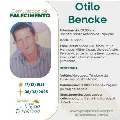 A Funerária São Cristóvão, juntamente com a família Bencke, comunica com pesar, o falecimento de OtiloBencke, ocorrido às 09h30 do dia 06/03/2025 no HSA de Tapejara com 83 anos de idade. Seu corpo está sendo velado na Capela Trindade da Funerária São Cristóvão. Celebração às 09 horas do dia 07/03/2025 e após seu sepultamento no Cemitério Municipal João Rombaldi.