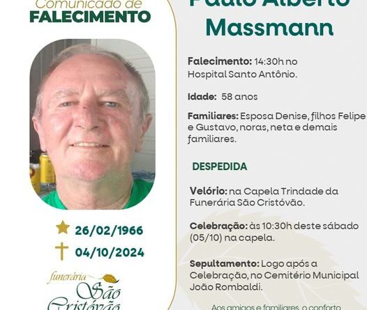 A Funerária São Cristóvão, juntamente com a família Massamann, comunica com pesar, o falecimento de Paulo Alberto Massmann, ocorrido às 14h30 do dia 04/10/2024 no HSA de Tapejara com 58 anos de idade. Seu corpo está sendo velado na Capela Trindade da Funerária São Cristóvão. Celebração às 10h30 do dia 05/10/2024 e após seu sepultamento no Cemitério Municipal João Rombaldi.
