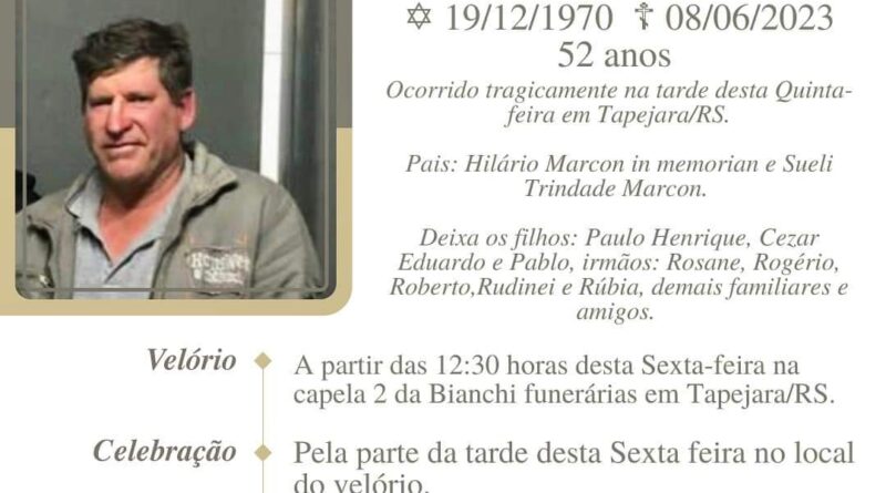 A Bianchi Funerárias, juntamente com a família Marcon, comunica com pesar, o trágico falecimento de Paulo César Marcon, ocorrido dia 08/06/2023 em Tapejara com 52 anos de idade. Seu corpo será velado a partir das 12h30min do dia 09/06/2023 na Capela II da Bianchi Funerárias. Celebração na tarde desta segunda-feira e após seu sepultamento no Cemitério Municipal João Rombaldi.