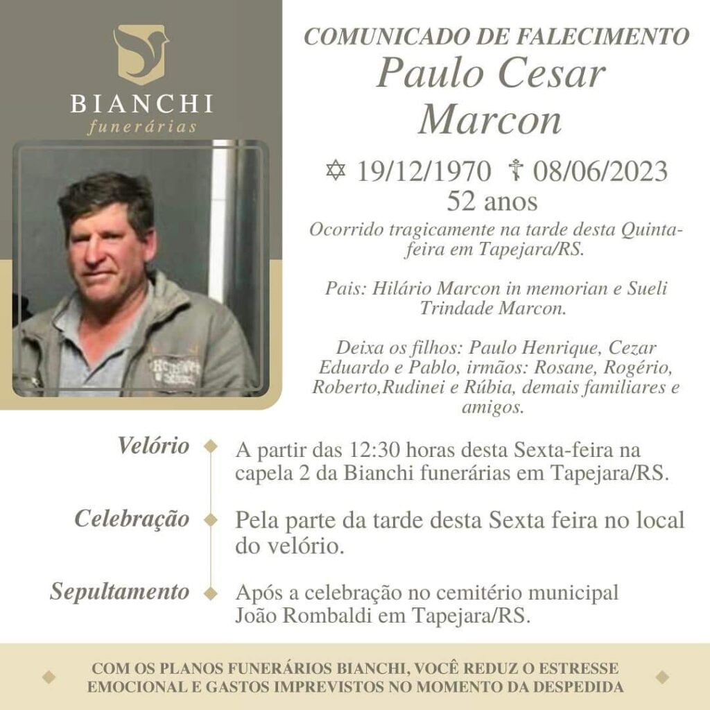 A Bianchi Funerárias, juntamente com a família Marcon, comunica com pesar, o trágico falecimento de Paulo César Marcon, ocorrido dia 08/06/2023 em Tapejara com 52 anos de idade. Seu corpo será velado a partir das 12h30min do dia 09/06/2023 na Capela II da Bianchi Funerárias. Celebração na tarde desta segunda-feira e após seu sepultamento no Cemitério Municipal João Rombaldi.