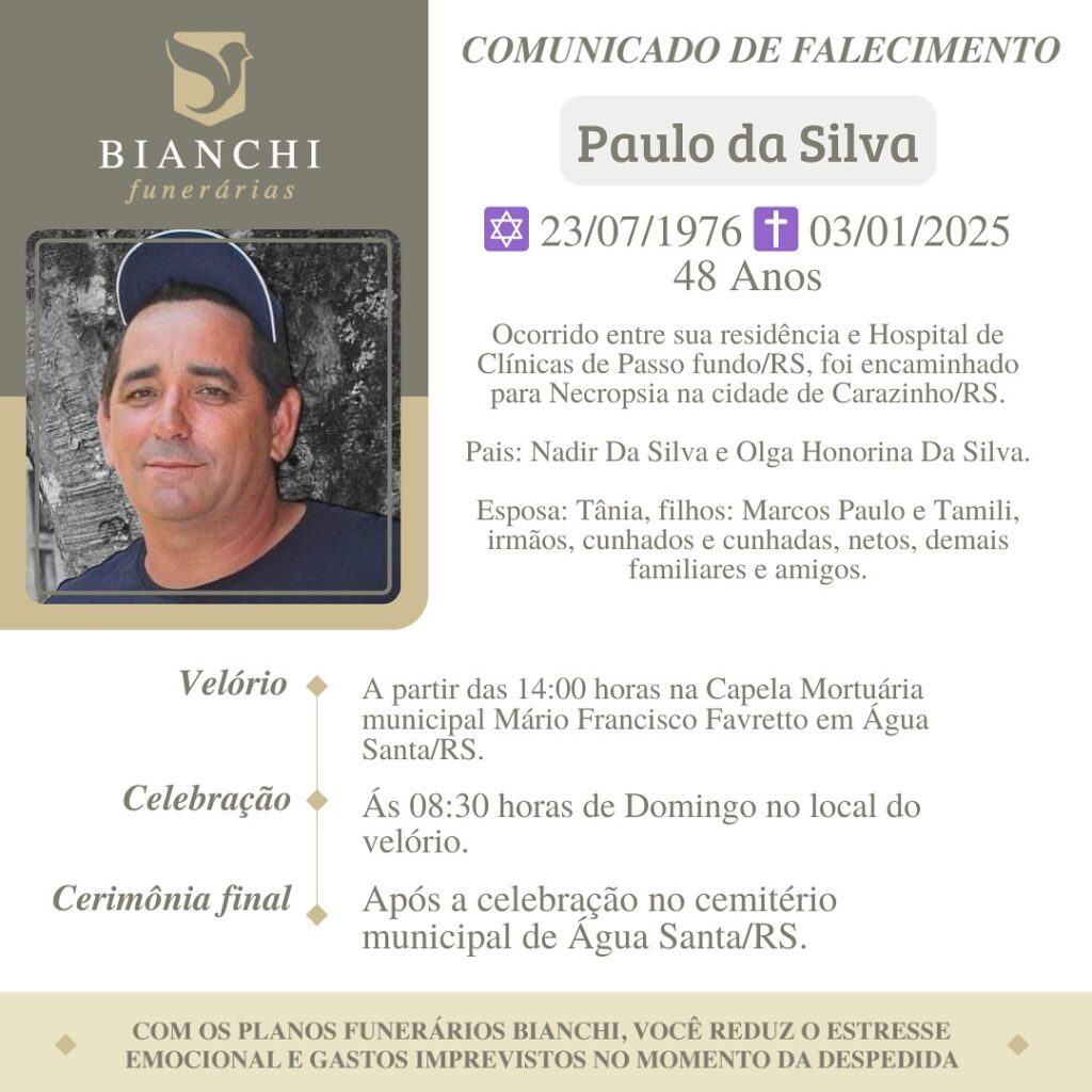 A Bianchi Funerárias, juntamente com a família Silva, comunica com pesar, o falecimento de Paulo da Silva, ocorrido dia 03/01/2025 entre sua residência e o Hospital de Clínicas de Passo Fundo. Seu corpo foi encaminhado para necropsia em Carazinho. Velório a partir das 14 horas do dia 04/01/2025 na Capela Municipal de Água Santa. Celebração às 08h30 do dia 05/01/2025 e após seu sepultamento no Cemitério Municipal de Água Santa.