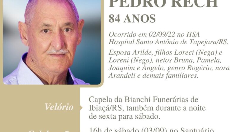 A Bianchi Funerárias, juntamente com a família Rech, comunica com pesar, o falecimento do senhor Pedro Rech, ocorrido dia 02/09/2022 no HSA de Tapejara com 89 anos de idade. Seu corpo está sendo velado na Capela da Bianchi Funerárias de Ibiaçá. Celebração às 16:00 horas de sábado (03/09/2022) no Santuário e após seu sepultamento no Cemitério Municipal de Ibiaçá.