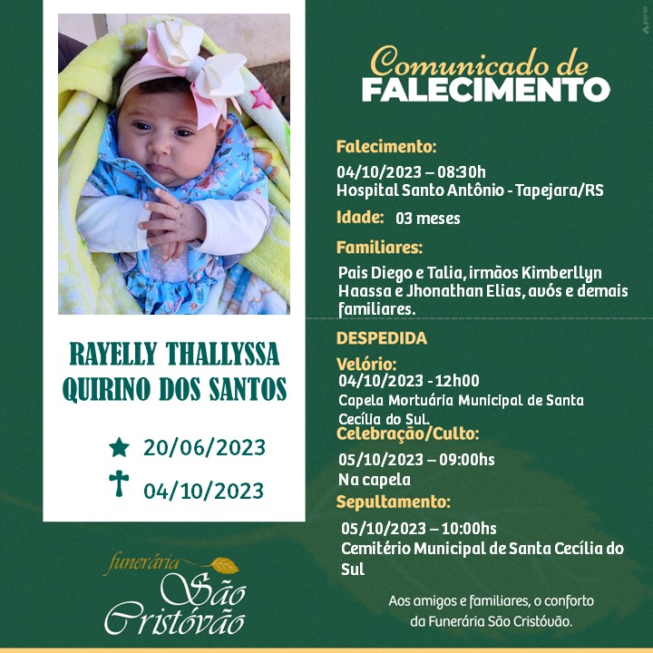 A Funerária São Cristóvão, juntamente com a família dos Santos, comunica com pesar, o falecimento de Rayelli Thallissa Quirino dos Santos, ocorrido às 08h 30 do dia 04/10/2023 no HSA com 3 meses de idade. Seu corpo está sendo velado na Capela Mortuária Municipal de Santa Cecília do Sul. Celebração às 09 horas do dia 05/10/2023 e após seu sepultamento no Cemitério Municipal de Santa Cecília do Sul.