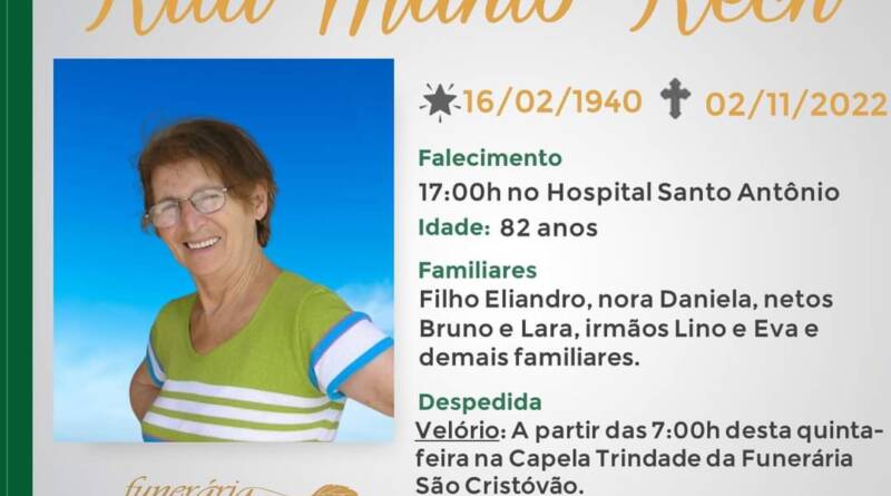 A Funerária São Cristóvão, juntamente com a família Rech, comunica com pesar, o falecimento da senhora Rita Manto Rech, ocorrido às 17:00 horas do dia 02/11 no HSA com 82 anos de idade. Seu corpo será velado a partir das 07:00 horas do dia 03/11 na Capela Trindade da Funerária São Cristóvão. Celebração às 14:30 horas e após seu sepultamento no Cemitério Municipal João Rombaldi.