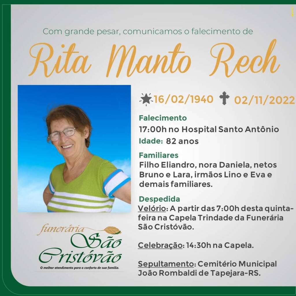 A Funerária São Cristóvão, juntamente com a família Rech, comunica com pesar, o falecimento da senhora Rita Manto Rech, ocorrido às 17:00 horas do dia 02/11 no HSA com 82 anos de idade. Seu corpo será velado a partir das 07:00 horas do dia 03/11 na Capela Trindade da Funerária São Cristóvão. Celebração às 14:30 horas e após seu sepultamento no Cemitério Municipal João Rombaldi.