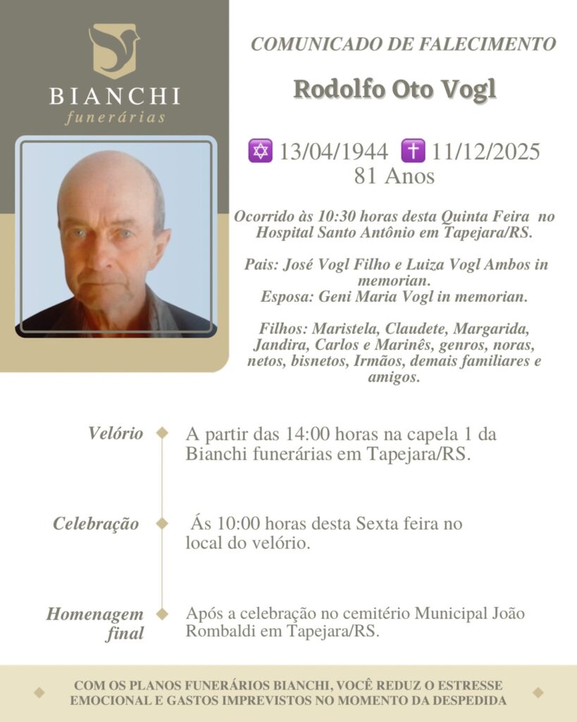 A Bianchi Funerárias, juntamente com a família Vogl, comunica com pesar, o falecimento de Rodolfo Oto Vogl, ocorrido às 10h30 do dia 11/12/2025 no HSA de Tapejara com 81anos de idade. Seu corpo está sendo velado na Capela 1 da Bianchi Funerárias. Celebração às 10 horas do dia 12/12/2025 e após seu sepultamento no Cemitério Municipal João Rombaldi.